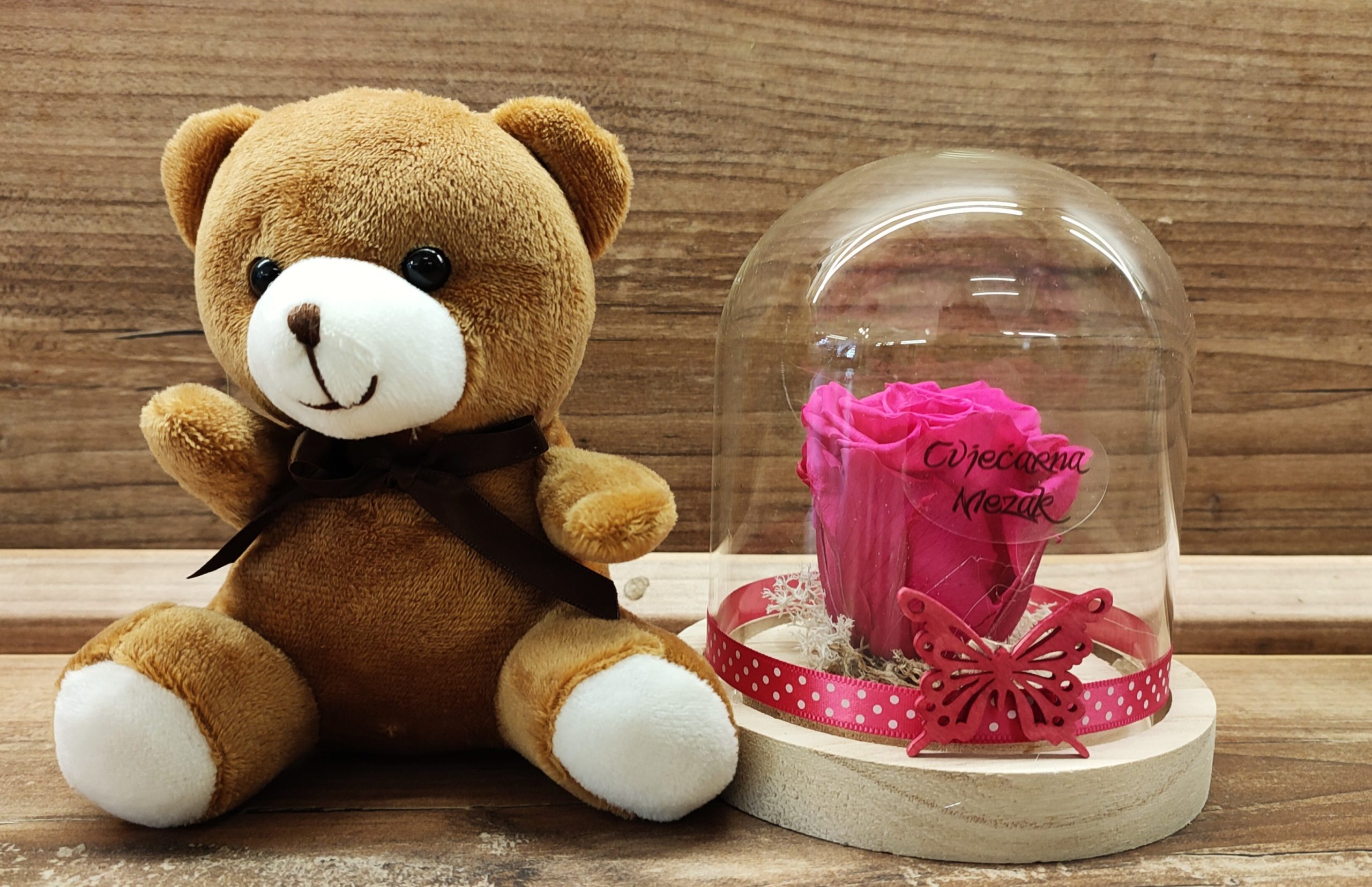 Dehidrirana ruža u staklenom zvonu + medvjedić 144Z