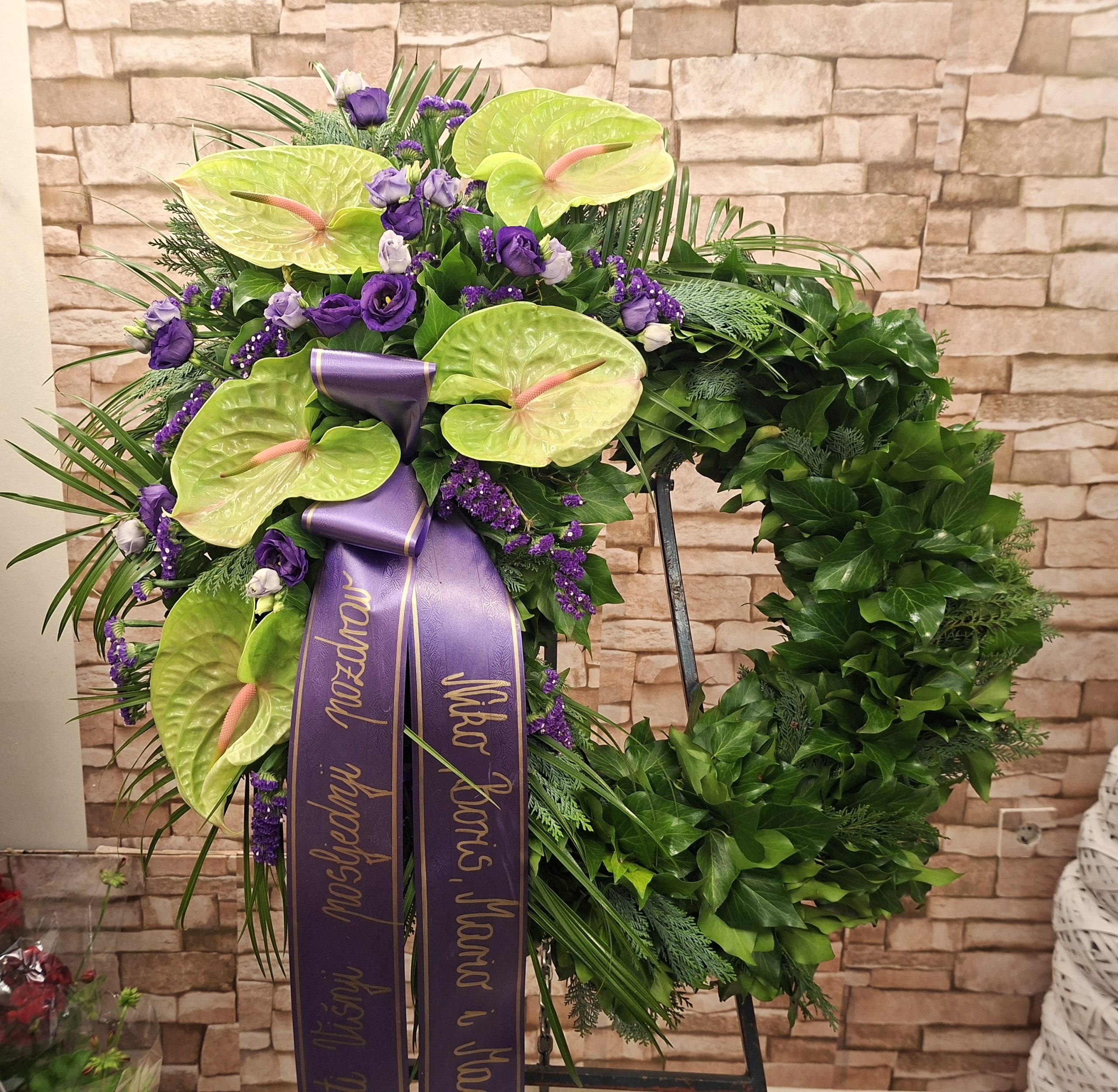 Vijenac opleten zelenilom sa aranžmanom od zelenih anthuriuma i ljubičastog sitnog cvijeća promjera cca 110cm.